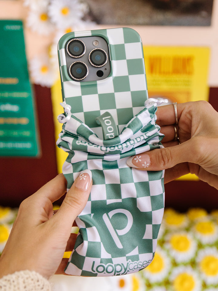 Our Green Checkered case has a matte finish and comes with a Eucalyptus Green with White Text Super Loop and matching microfiber bag.