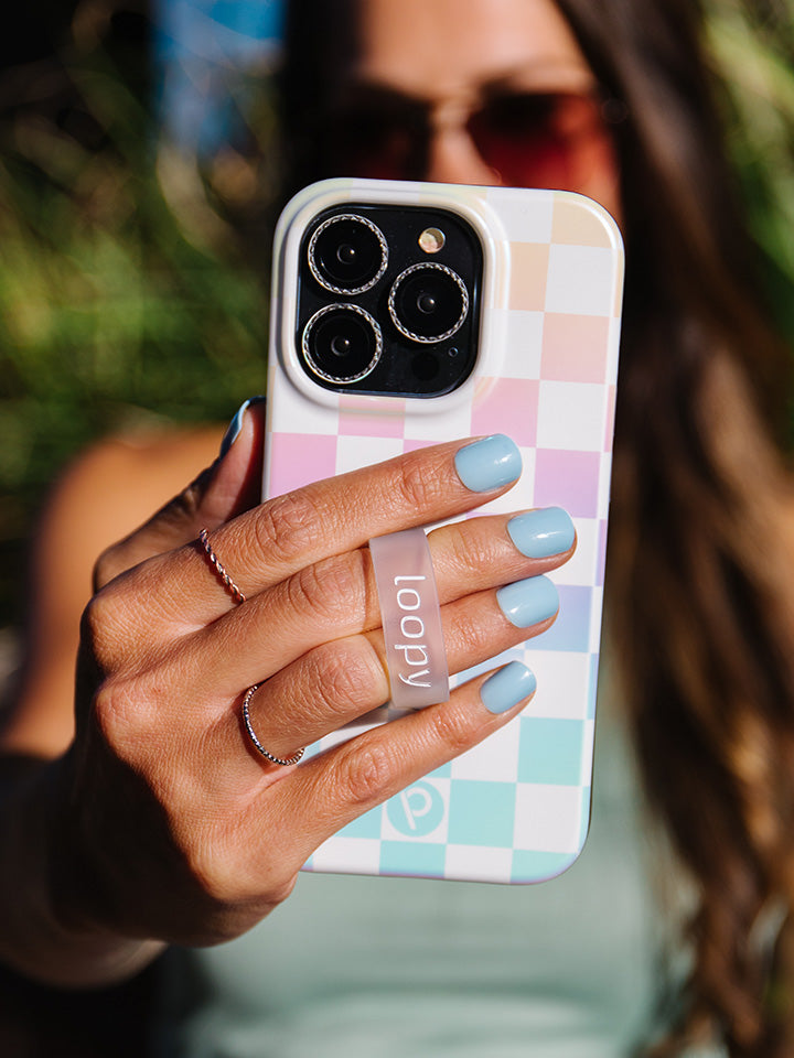Our Pearl Checkered case has an iridescent matte finish and comes with a Clear with White Text Super Loop and matching microfiber bag.