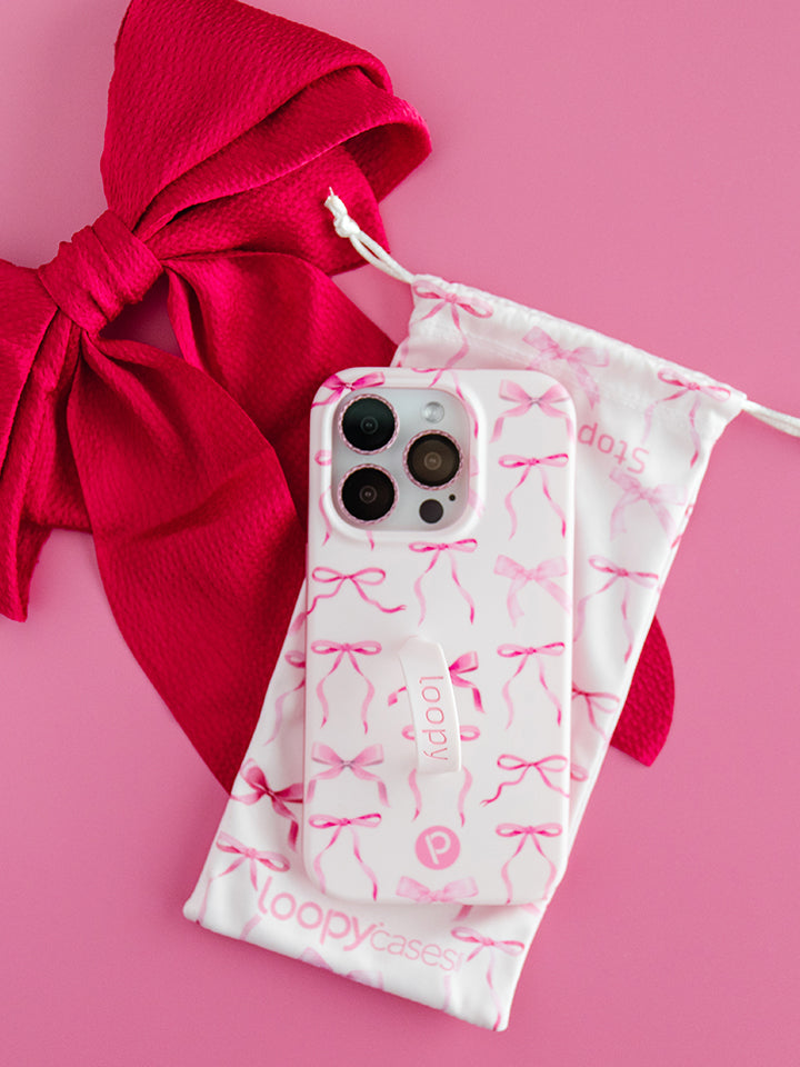 Our Pink Bows case has a matte finish and comes with an Ivory with Pink Text Super Loop and matching microfiber bag.