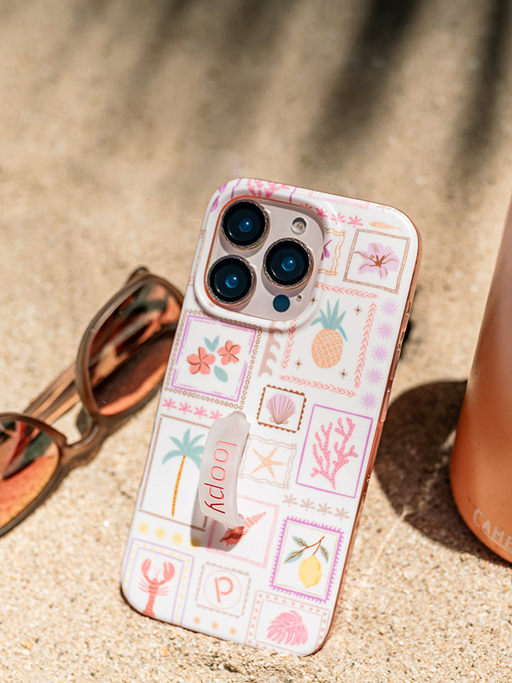 Our Seaside Stamps case has a matte finish and comes with a Clear with Coral Text Super Loop and matching microfiber bag.