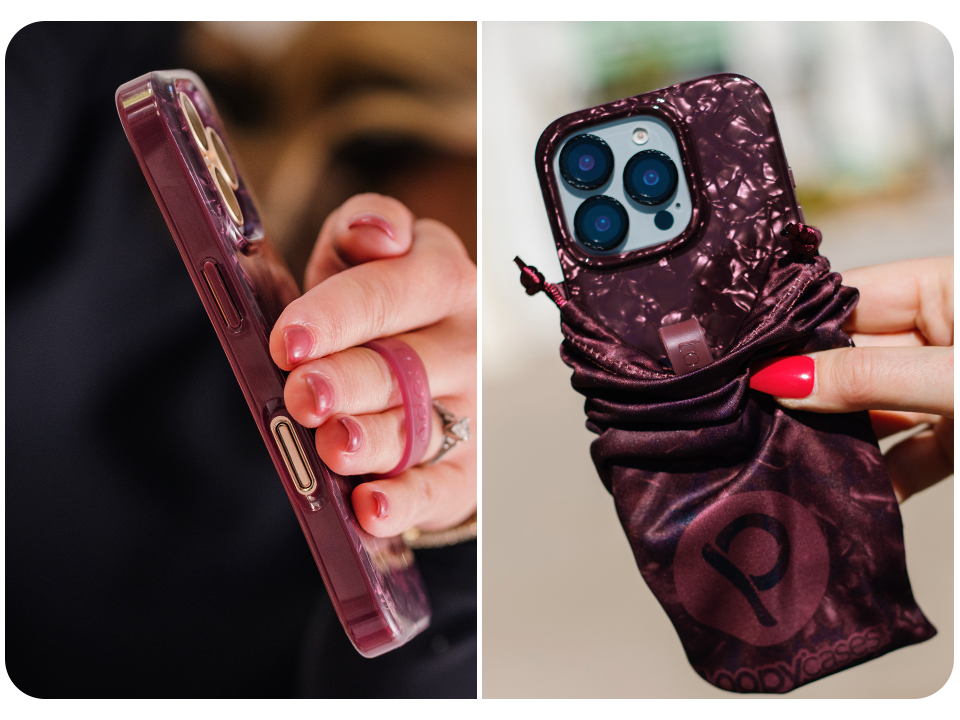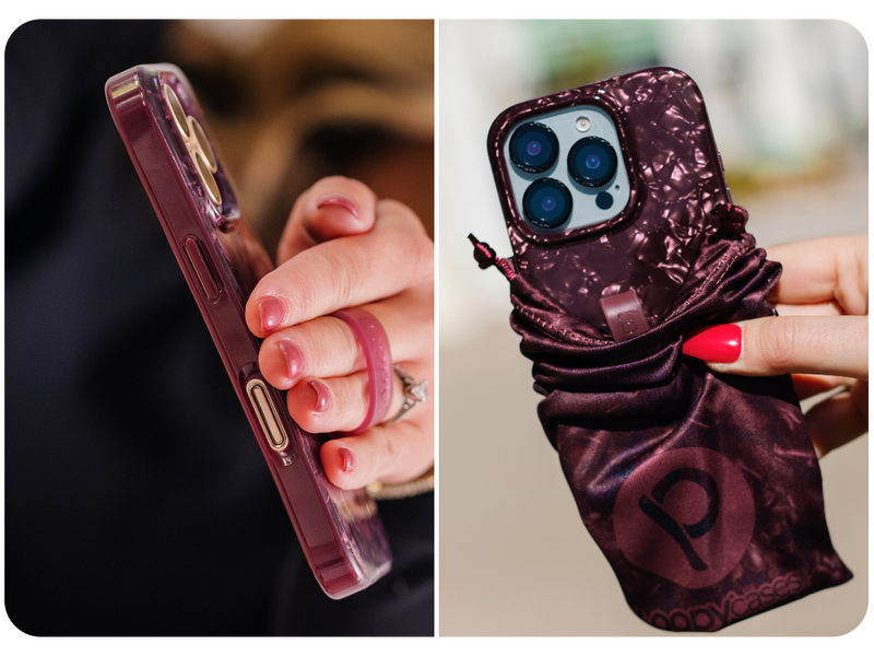 A woman holding a Wine Opal Shell Loopy Case. || feature-media