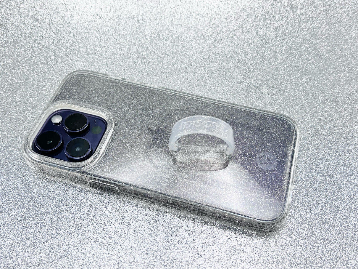 A closeup of Clear Sparkle Silver Loopy Case.|| feature-medias