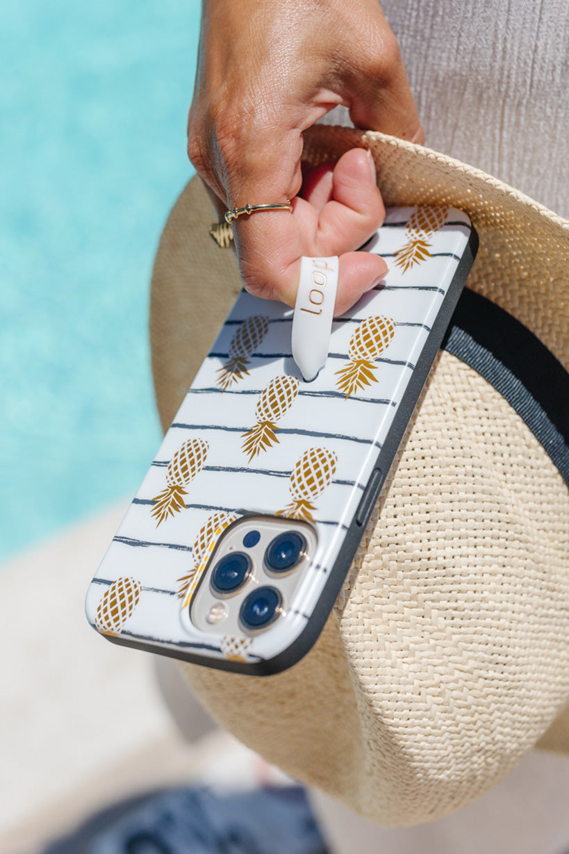 Our Pineapple case has a matte finish with gold metallic accents and comes with a White with Black Text Super Loop and matching microfiber bag.