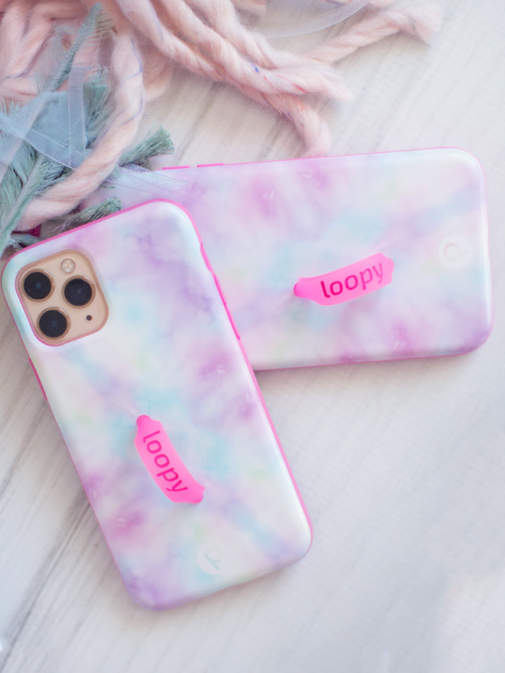 Our Tie Dye case has a matte finish and comes with a Clear Neon Pink Super Loop and matching microfiber bag.