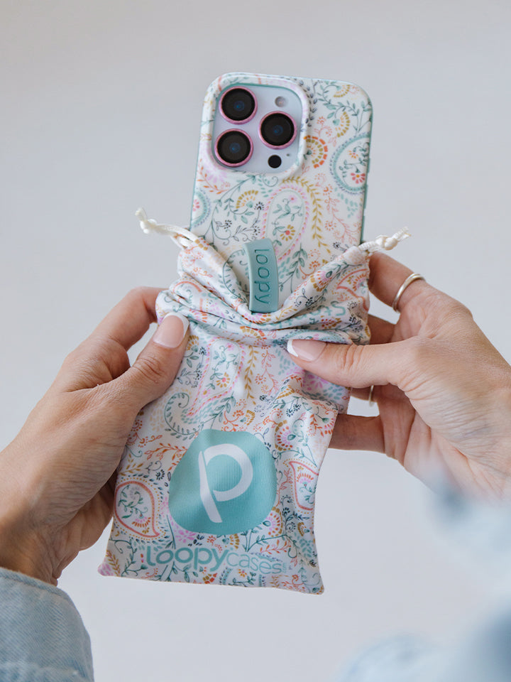 A woman holding a Painted Paisley Loopy Case. || feature-media