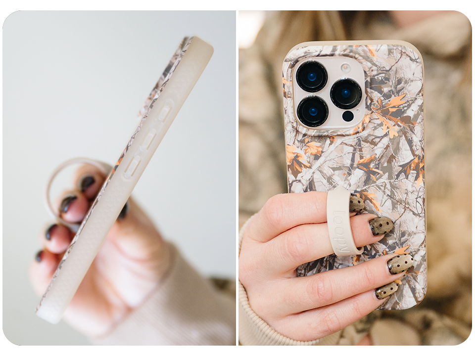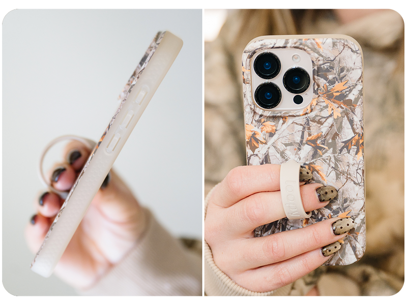 A woman talking on the phone while using a Tree Camo Loopy Case. || feature-media
