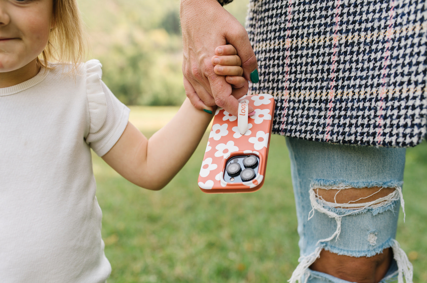 A woman holding an Auburn Daisies Loopy Case with a Sandstone Super Loop.|| feature-media