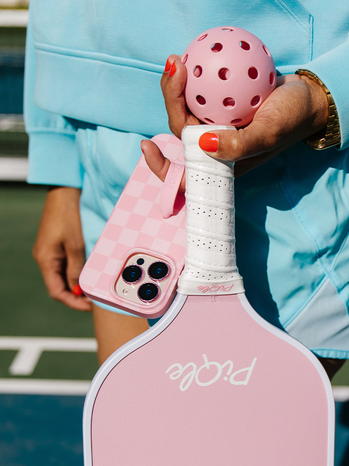 Our Blush Checkered case has a matte finish and comes with a Blush Super Loop and matching microfiber bag.