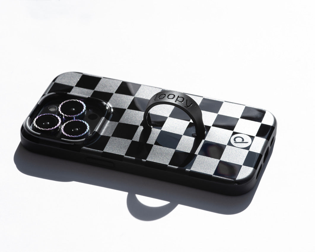 A close up of a Midnight Checkered Loopy Case. || feature-media