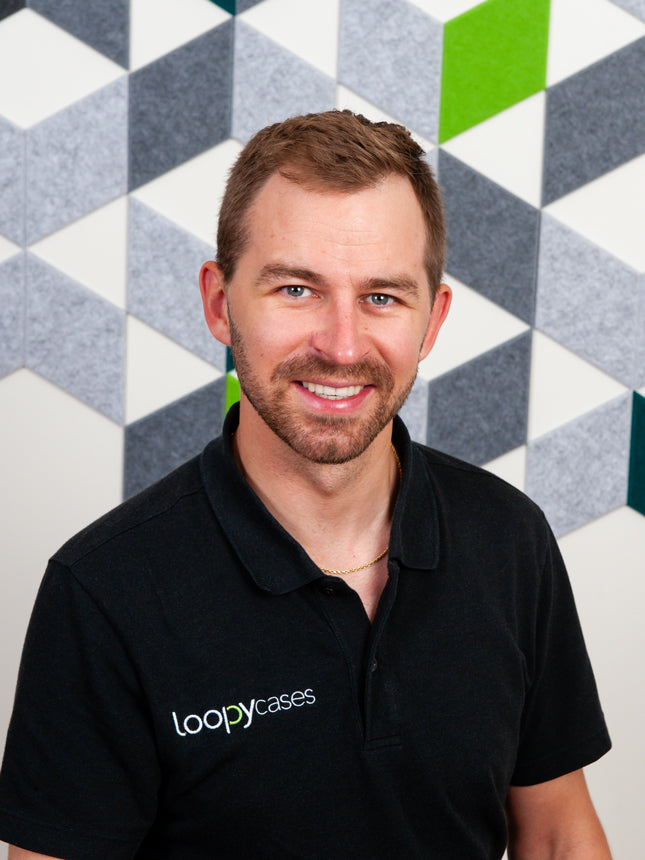 With the slimmest protective case he could find, John secured a finger loop with some good ‘ole duct tape and headphone wire to the back of it. From that initial ‘eureka’ moment, the first Loopy Case was born.