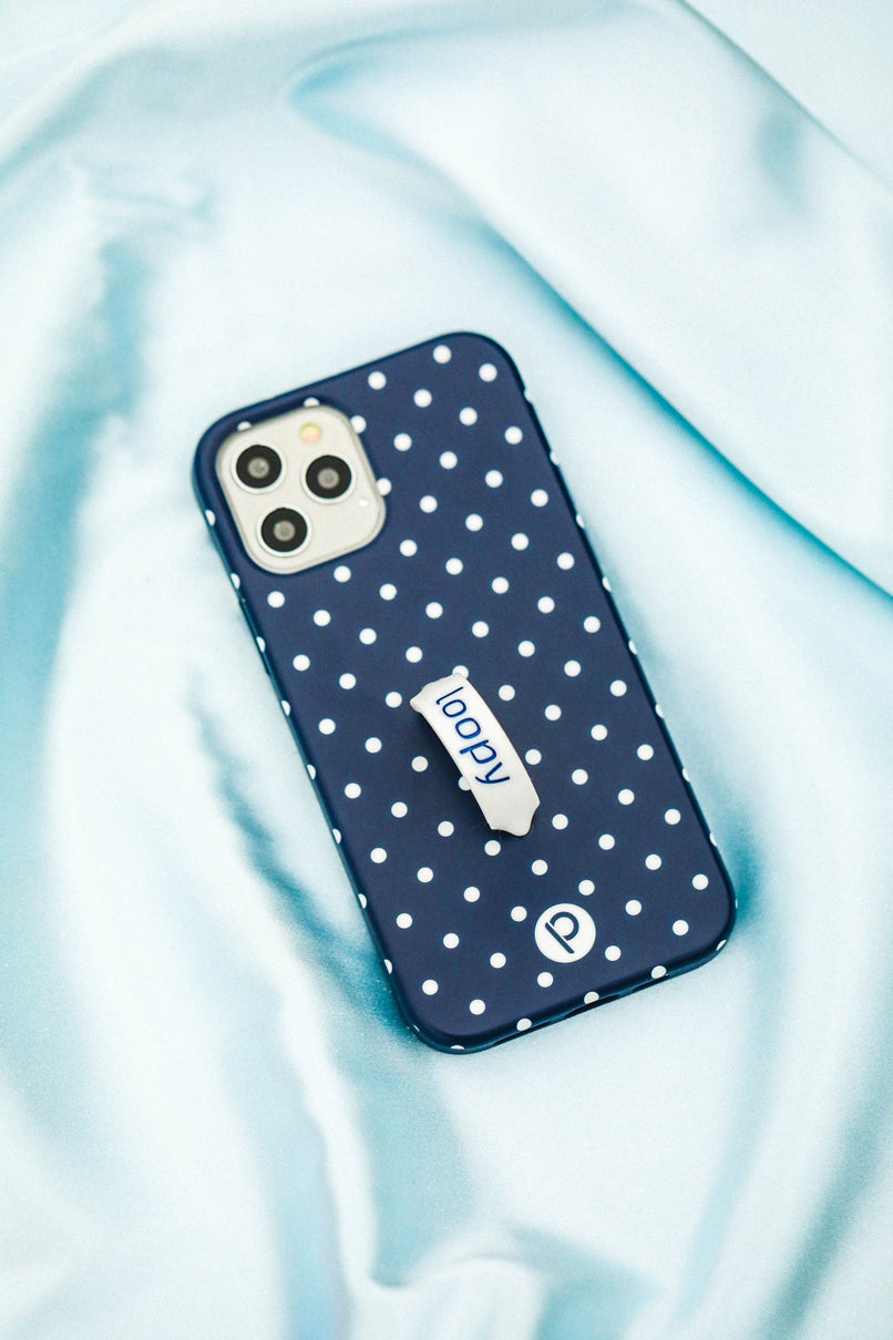 Our Navy Polka Dots case has a matte finish and comes with a White with Navy Blue Text Super Loop and matching microfiber bag.